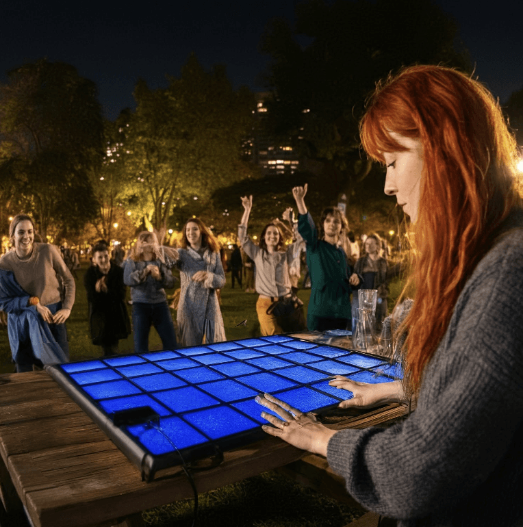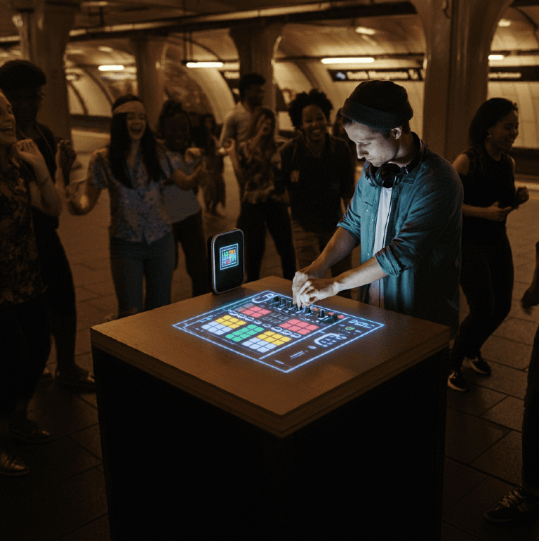 The UI supports quick sound layering, looping, and iteration, allowing users to engage with music playfully without the friction of traditional production tools.